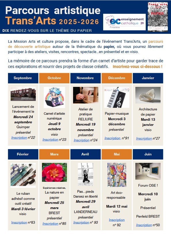 Trans’Arts 2026 : Pour la 20ème année consécutive, l’Enseignement Catholique de Bretagne, propose à tous les établissements (1er et 2nd degrés) de s’inscrire dans la démarche « Trans’Arts ». Cette opération représente un temps fort de création et d’expression au service du patrimoine, du développement durable, des sciences et des arts.